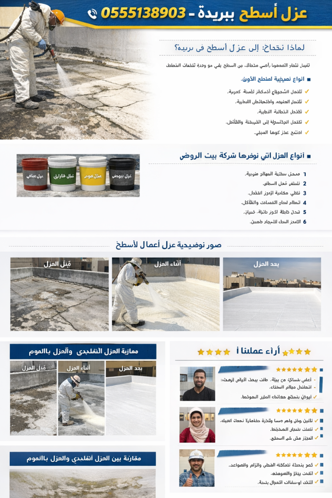 إذا كنت تبحث عن أفضل شركة عزل أسطح في بريدة تجمع بين الجودة والسعر المناسب والضمان الحقيقي، فإن شركة بيت الروض هي خيارك الأمثل. تواصل الآن على الرقم 0555138903 واحصل على معاينة مجانية وخدمة احترافية تضمن راحة بالك لسنوات طويلة.